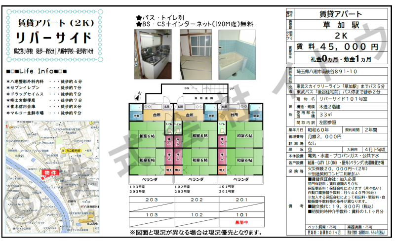 | 交通 | 東武スカイツリーライン「草加駅」までバス5分 「後谷住宅前」バス停まで徒歩2分 |