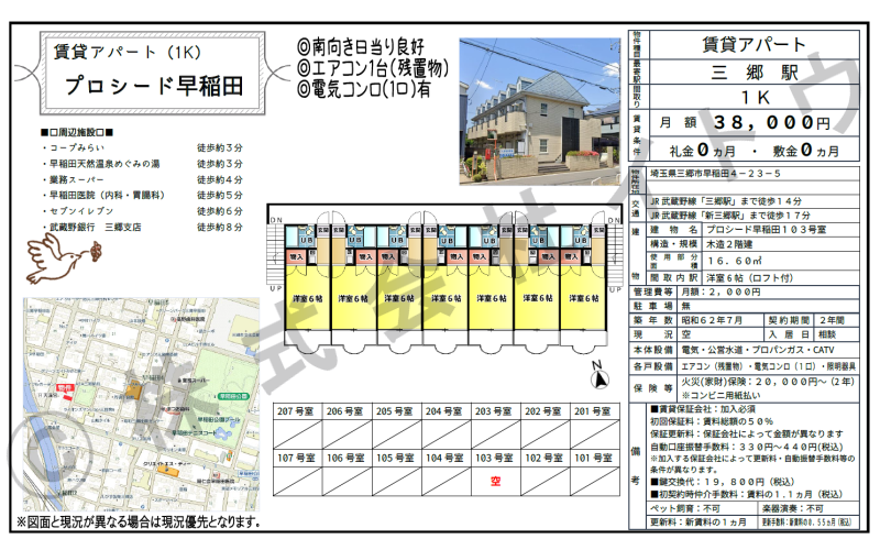 周辺施設等 | ●コープみらい …徒歩約3分 ●早稲田天然温泉めぐみの湯 …徒歩約3分 ●業務スーパー …徒歩約4分 ●早稲田医院(内科/胃腸科) …徒歩約5分 ●セブンイレブン …徒歩約6分 ●武蔵野銀行 三郷支店 …徒歩約8分 |